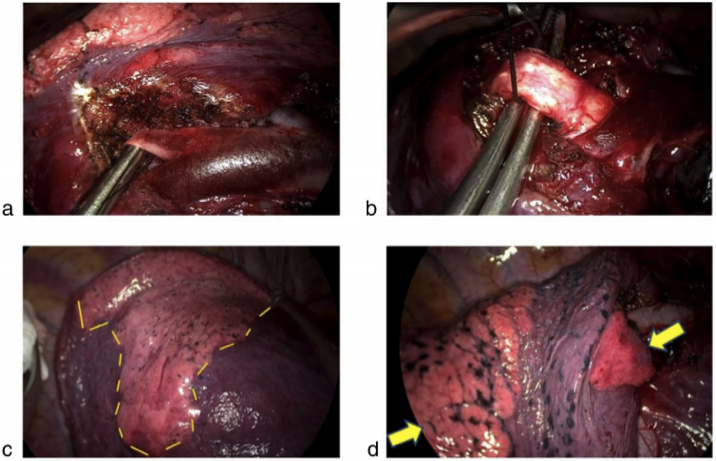 图2. (a)暴露并解剖节段动脉RA9和(b)节段支气管RB9。(c)在改进的充气-放气方法后,右下叶膈面S9节间平面分界明显。(d)在改进的充气-放气方法后,在叶的两端可以看到目标节段(由黄色箭头指示)