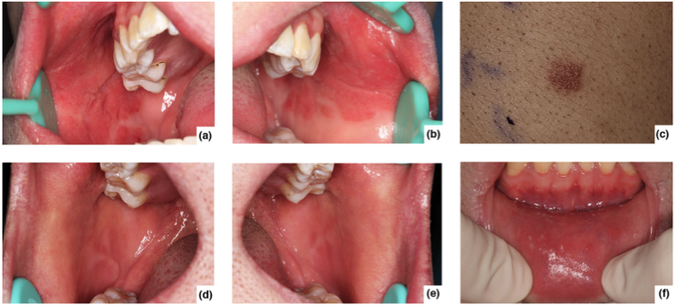 口腔内检查显示粘膜广泛的双侧肿胀和红斑(图1a,b)。口腔中没有牙科金属材料。含1.0%氯化亚锡的斑贴试验结果显示强阳性反应(++)以及皮肤红斑和丘疹(图1c)。10%稀释牙膏的斑贴试验显示可疑反应(±),有轻微红斑。用普通含氟牙膏代替这种牙膏,并用基于类固醇的漱口液治疗患者2周后,口腔病变得到解决(图1d,e)。在重新使用脱敏牙膏五次后,下唇粘膜再次出现类似的损伤(图1f)。这些病变在停用牙膏7天后完全消失。