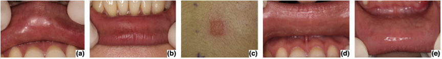 图2. (a,b)由脱敏牙膏引起的过敏性接触性口炎的临床表现。(d,e)在病例2治疗前和治疗后。(c)斑贴试验的强烈反应(++)