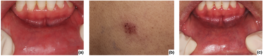 图3. (a)由脱敏牙膏引起的过敏性接触性口炎的临床表现。(c)在病例3治疗之前和之后。(b)斑贴试验的强阳性反应(++)