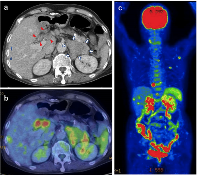 腹部超声显示肝脏多发结节。计算机断层扫描(CT)显示,左侧肾上腺有一个60mm的肿块,肾动脉和肝总动脉周围的淋巴结肿大,肝右叶有多个结节(图1a)。正电子发射断层扫描(PET)显示,氟脱氧葡萄糖F18在与CT所见病灶相同的区域,以及在左肩胛骨、左第六肋骨和第九胸椎左侧突起的积聚增加(图1b,c)。根据这些发现,放射科医生怀疑肾上腺癌在全身有多处转移。此后,患者出现发烧,获得两组血培养物。三天后检测到革兰氏阳性杆菌。将细菌与含5%羊血的胰蛋白酶大豆琼脂传代培养,经鉴定为单增李斯特菌。