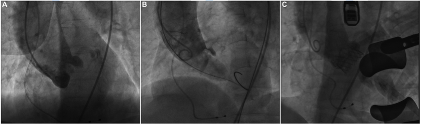 图2. 术中透视。(A)透视显示球囊预扩张前双侧冠状动脉畅通。(B)在球囊扩张期间,右冠状动脉不可见,左冠状动脉血流减少。(C)透视显示J -Valve瓣膜展开后双侧冠状动脉通畅