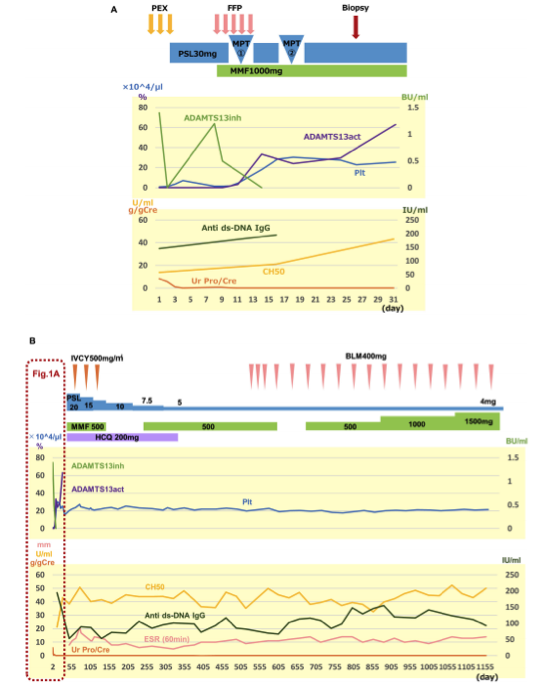 临床过程如图1所示。入院后,为TMA进行了3天的PE,成功地将血小板计数快速增至71000/uL,PE完成。由于患者符合SLE诊断标准,包括在住院第3天抗核抗体和抗ds DNA抗体阳性,因此开始使用泼尼松龙(1mg/kg)。住院第7天,血小板计数降至10000/uL。再次考虑PE;然而,患者太痛苦,无法接受PE。因此,首先尝试给予新鲜冷冻血浆,发现其不足以显著改善血小板计数。同时,获得了ADAMTS13活性和抗ADAMTS3抗体的结果。因此,患者被诊断为由SLE引起的获得性TTP,并在住院第10天服用MPT。经过两个疗程的MPT后,抗ADAMTS13抗体测试结果为阴性,ADAMTS3活性增加,血小板计数迅速增加(图1A)。此外,在脉冲治疗的第一个疗程后,尿液检查结果正常。对SLE给予霉酚酸酯(MMF,1000 mg/天)和羟氯喹(HCQ,200 mg/天)。由于患者被认为是SLE器官损害的高危人群,并且已知TMA有常见的精神症状并发症,因此患者还接受了三个疗程的静脉环磷酰胺脉冲疗法[IVCY,580mg/剂(500mg/m2)]作为SLE的诱导疗法(图1B)。IVCY三个疗程后,观察到白细胞减少,主要是淋巴细胞;因此,MMF暂停。由于在常规眼科检查中怀疑色盲和视网膜病变,HCQ被停止。发病1年零4个月后,开始服用贝利单抗(BLM)(图1B)。
