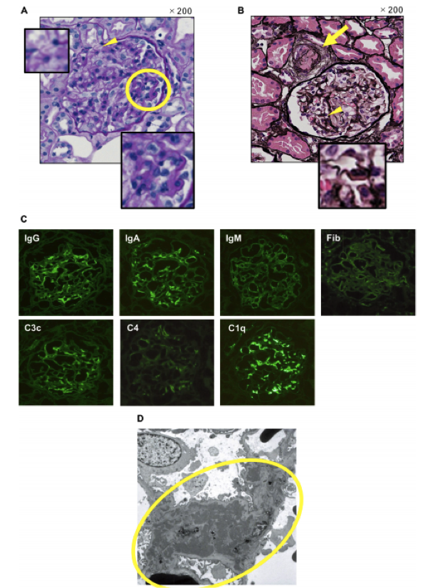在住院第25天进行肾活检。肾脏病理学的光镜结果显示局灶性和节段性轻度内皮下沉积、基底膜增厚和内皮细胞增殖。这些发现符合狼疮性肾炎的病理诊断(图2A)。值得注意的是,在入球小动脉中发现颗粒状高碘酸-希夫染色阳性血栓,在26个肾小球中的6个肾小球中观察到入球小动脉管腔狭窄,与TTP一致(图2B)。免疫荧光染色(IF)显示毛细血管壁和主要系膜旁区阳性(图2C)。用电子显微镜观察到在系膜旁区有电子致密沉积物,这与IF结果相当(图2D)。