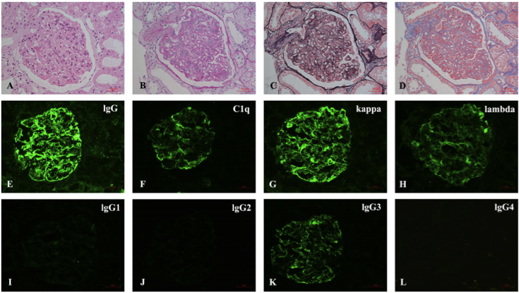 眼部染色阳性。唾液腺活检显示两个>50个淋巴细胞的密集聚集。骨骼肌活检显示,散在的巨噬细胞浸润在肌内区。基于这些发现,建立了与SS相关的SLE诊断。进行肾活检以评估患者的病理损伤。