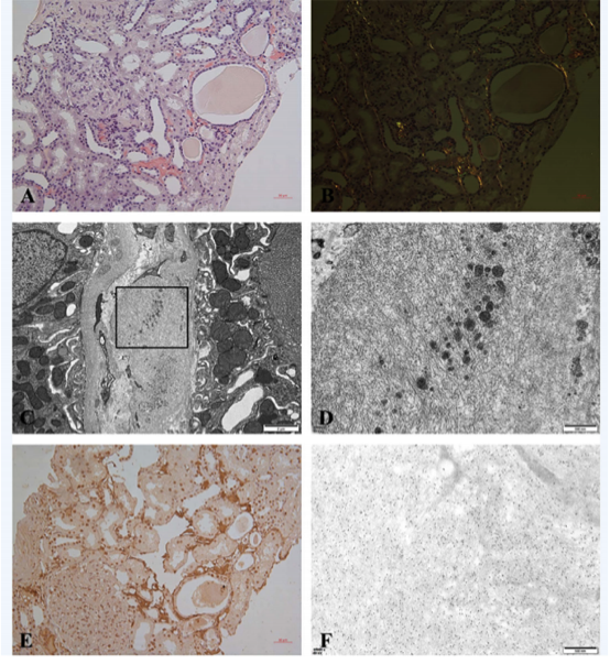 肾脏活检结果显示,光镜下标本中有18个肾小球,包括一个整体硬化的肾小球。其他肾小球表现为弥漫性增生性肾小球肾炎,严重的系膜细胞和基质增生,肾小球基底膜增厚,呈双轮廓;检测到系膜和内皮下嗜酸性细胞沉积。冰冻组织的免疫荧光显示肾小球系膜区和毛细血管壁上IgG(3+)、IgA(2+)、IgM(2+),C3c(2+)和C1q(2+)颗粒染色,κ(3+),λ(+2+),IgG2(+)和lgG3(2+)。IgG1和IgG4均为阴性(图1)。此外,在皮质间质和小动脉壁中发现片状亲刚果沉积物,在偏振光下显示苹果绿双折射。电子显微镜显示皮质间质淀粉样沉积物中直径为10nm的随机坚硬纤维。通过免疫组织化学染色和免疫电子显微镜,淀粉样沉积物对LECT2蛋白呈阳性(图2)。