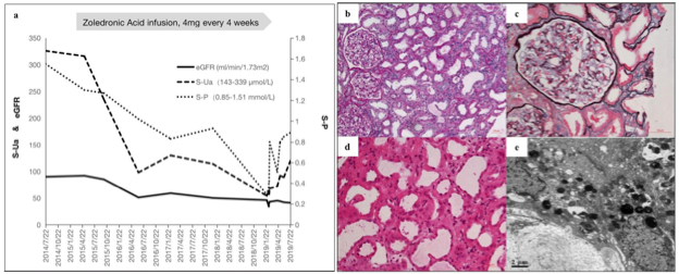 本病例为典型的ZA诱导肾损伤,表现为肾范可尼综合征的临床综合征,伴有远端肾小管酸中毒和肾病理中的肾小管损伤。最重要的是,降低ZA输注频率后,CKD的快速进展可能会延迟。通过本病案希望与ZA诱导的肾损伤早期体征相关的电解质失衡能够引起更多的关注,并强调密切监测的重要性。