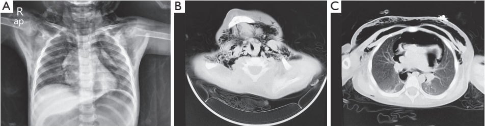大约4小时后,患儿哭后出现烦躁和发绀。急诊胸部X光检查显示双侧颈部和胸壁有皮下气体,并有纵隔气肿的可能性(图1A)。立即通过鼻插管给氧,并使用14号针头进行皮下排气。进一步的计算机断层扫描(CT)显示右肺上叶和双肺下叶轻度炎症,颈部和双侧胸壁皮下气肿,以及纵隔气肿(图1B、1C)。密切观察了患儿的病情变化。