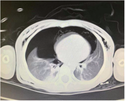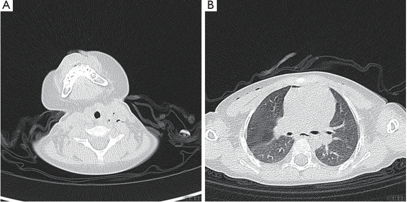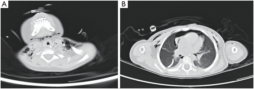 图4. CT显示颈部、纵隔和胸壁有少量皮下气肿