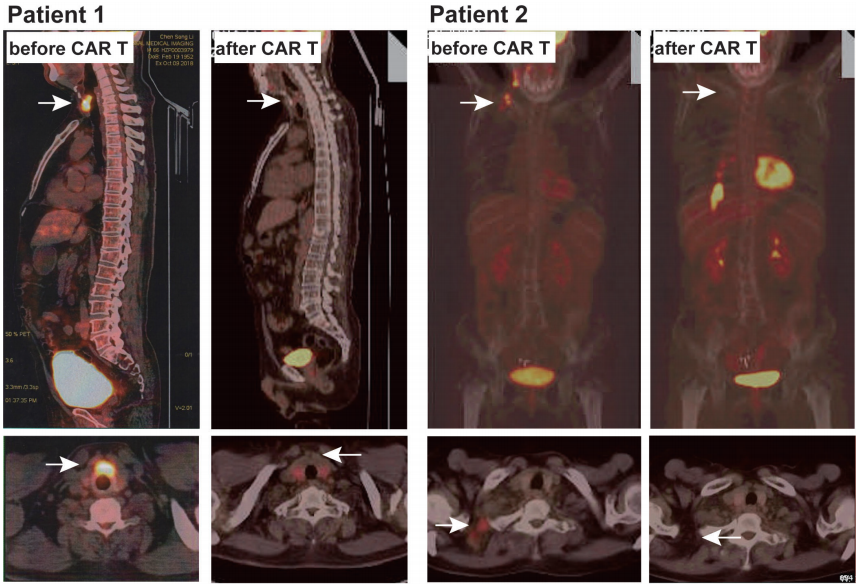 图1. CAR T治疗前后两名患者的PET-CT图像