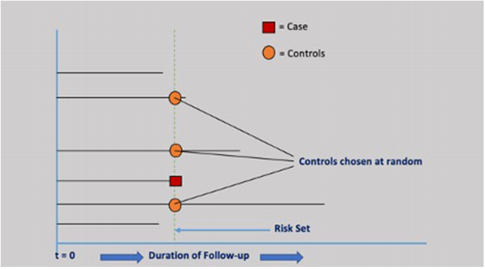 使用风险集抽样方法将病例与研究随访期间发生的每个病例的风险集随机样本进行匹配。所采用的嵌套案例控制分析的示意图如图1所示。