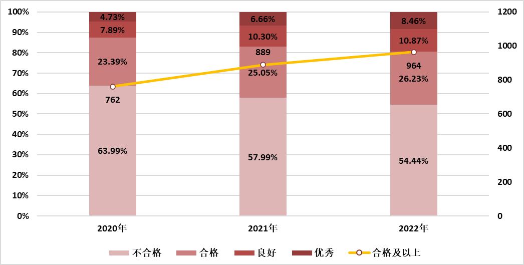 参评的2116家县医院,2021年度达到基本标准合格及以上的有1837家(占比86.81%),达到推荐标准合格及以上的有889家(占比42.01%),较2020年度分别增加17家和127家;2022年度达到基本标准合格及以上的有1856家(占比87.71%),达到推荐标准合格及以上的有964家(占比45.56%),较2021年度分别增加19家和75家(见图1、图2)。