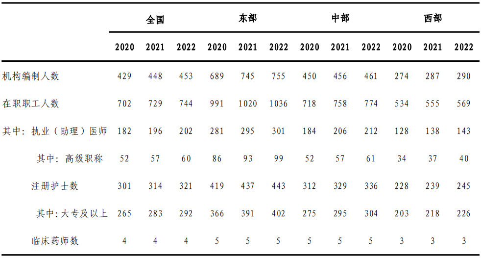 (一)人才梯队持续优化。全国县医院在职职工人数、卫生技术人员数、执业(助理)医师数、注册护士数及临床药师数均稳中有增(见表1)。中部地区平均每家医院执业(助理)医师数增量最多,西部地区临床药师数增幅最大。县医院执业(助理)医师硕士及以上学历人员、高级职称人员较2020年度增长率均超过15%,护士中具有大专及以上学历者较2020年度增长10.19%,专业技术人员学历和职称结构持续优化。
