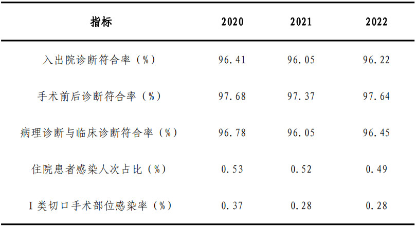 二是医疗质量与安全保障保持平稳。近3年县医院在入出院诊断符合率、手术前后诊断符合率、病理诊断与临床诊断符合率、住院患者感染人次占比方面趋于平稳,I类切口手术部位感染率稳定在较低水平(见表2)。