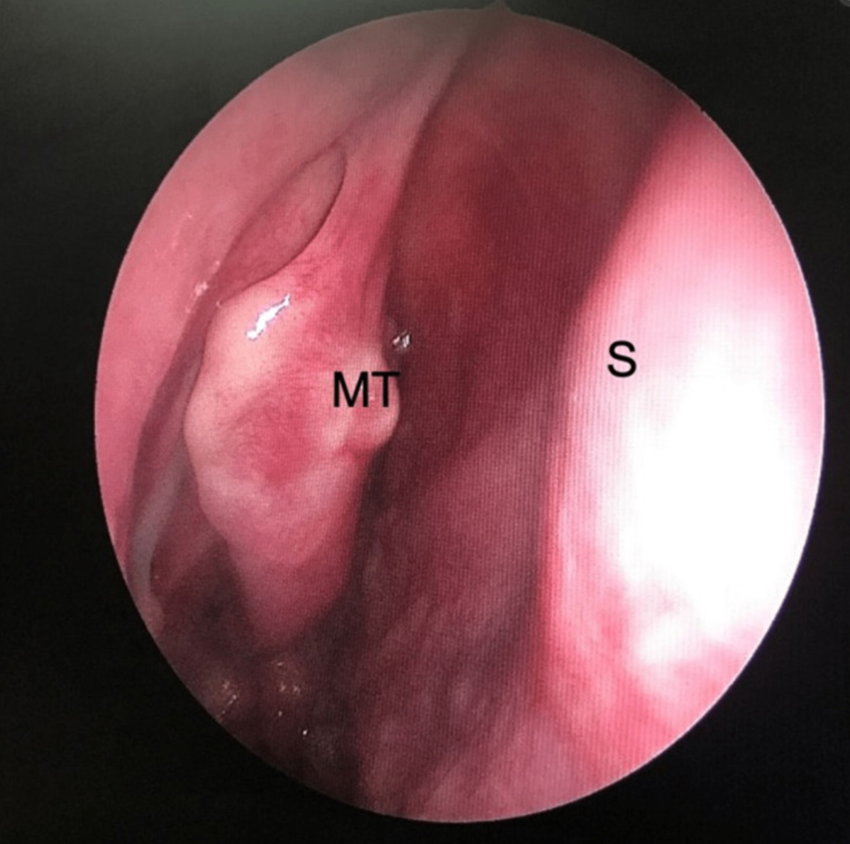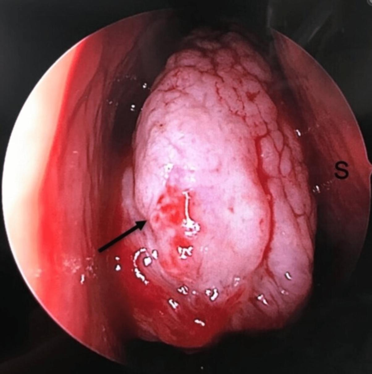 第一次就诊时对肿物进行的初步活检提示为良性炎症性鼻息肉。为进一步诊断和治疗,行鼻内镜下鼻腔肿物切除术。术中发现固体肿块,表面不规则,内里硬度一致,起源于中鼻甲前端,整个右鼻腔占位。手术保留了邻近骨壁和鼻中隔粘膜。肿瘤用冷兵器完整切除,上颌窦未见异常。术中和术后均无大出血。