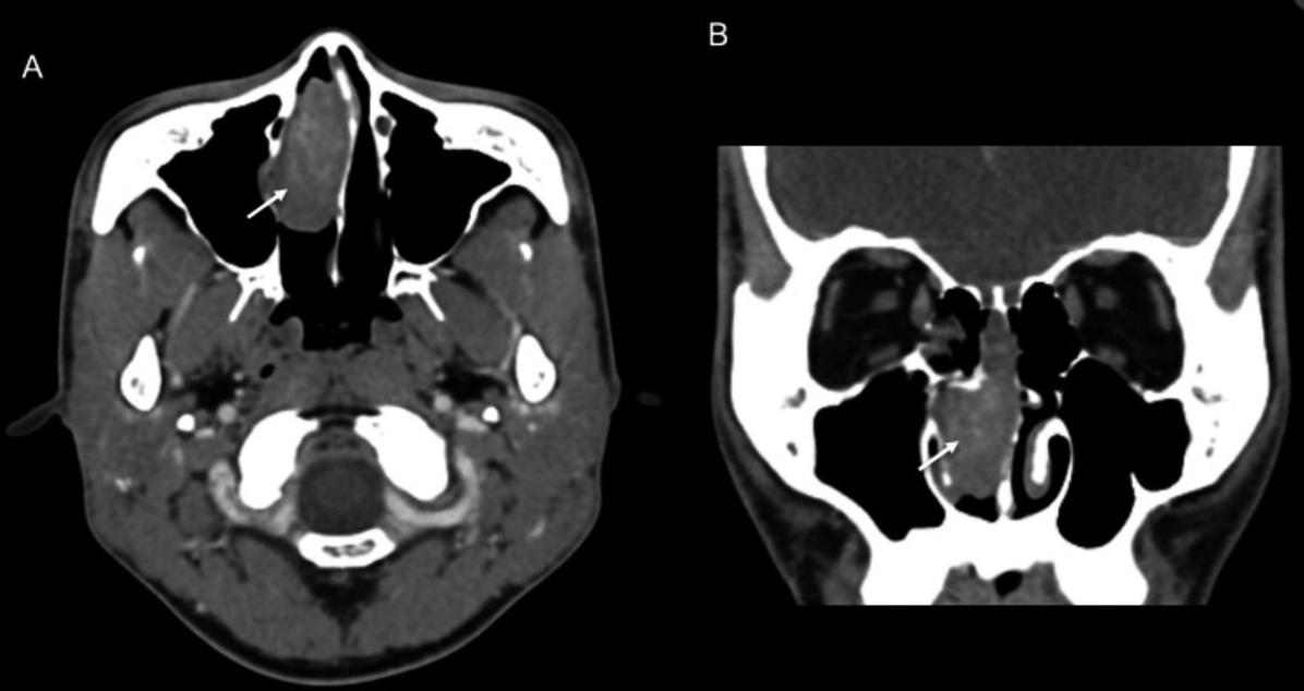 大多数胸膜外孤立性肿瘤遵循良性过程,表现为由于肿瘤进展而对附近结构进行的压迫症状,与其他解剖部位类似,鼻腔SFT没有性别偏好。呈现的年龄从18-79岁不等,平均年龄为49岁。SFT发生在鼻腔时,表现为非特异性症状,如单侧鼻塞、鼻漏、头痛,有时合并鼻出血。这些症状可以伴随任何鼻腔肿瘤,并无SFT的诊断特异性。单侧鼻腔肿无有一些鉴别诊断,包括鼻息肉、内翻性乳头状瘤、血管纤维瘤和恶性肿瘤,如鼻窦癌和淋巴瘤。
