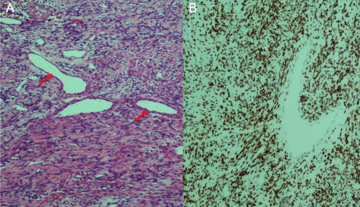 术后病理检查显示,肿瘤边界清晰,间质由淡纺锤形细胞组成,增殖呈局灶性束状。肿瘤细胞之间可见胶原纤维,少见有丝分裂活动。肿瘤细胞在免疫组织化学(IHC)染色中显示出CD34的局灶性阳性,STAT6的强扩散核染色支持SFT的诊断(图3)。