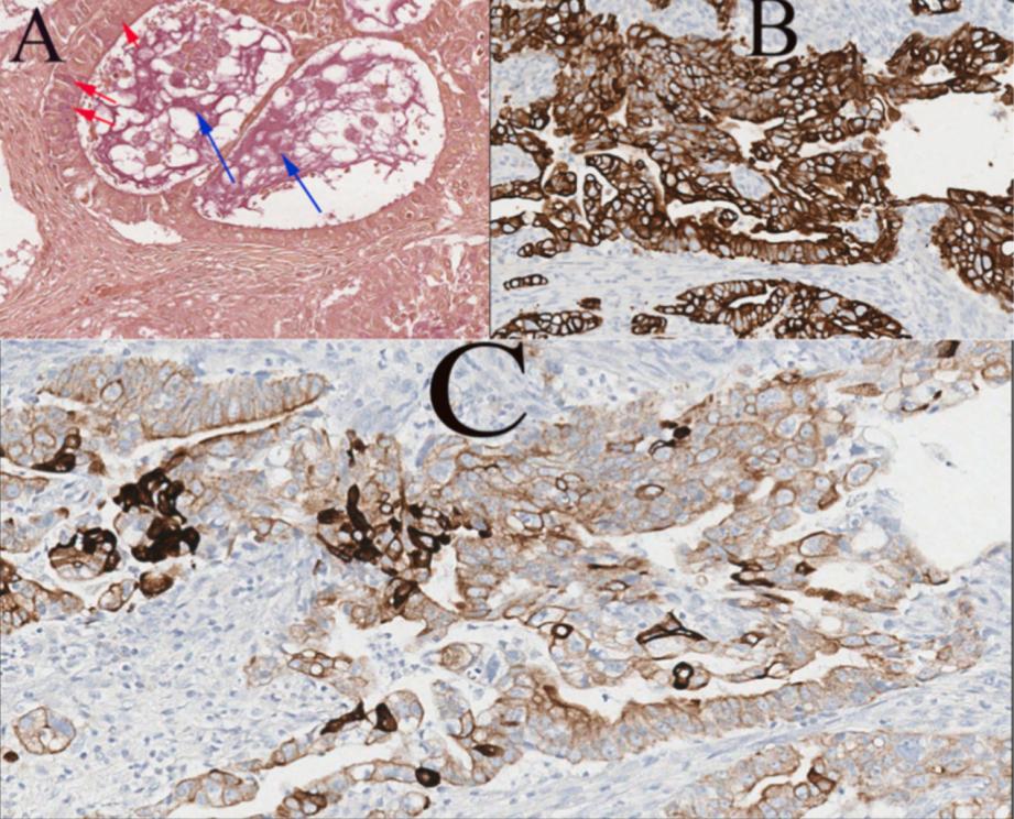 病理大体检查显示,右侧精囊的开口及其囊性病变有数个乳头状突起,并存在含有大量组织和坏死碎片的粘稠粘液。精囊壁的显微镜检查显示癌性增生,由突起到精囊腔的乳头和数量较少的浸润管组成。肿瘤细胞有大量嗜酸性或透明粘蛋白填充的细胞质,细胞核明显不典型,表现为大量有丝分裂和明显的异型性。没有发现杯状细胞或鞋钉样瘤细胞(图2)。