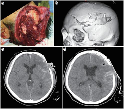 随后,大脑中动脉皮质段切面及脑组织大面积碎裂处出现大量出血。动脉采用凝固止血。最小限度地止血并用3000毫升生理盐水冲洗被污染的脑组织。随后,整形外科医生从右大腿上取下深筋膜,以闭合被撕裂成碎片的硬脑膜。然后使用筋膜和纤维蛋白胶进行硬脑膜成形术(图2a)。病人的一部分皮肤在受伤时被螺旋桨大面积切除并丢失。整形外科医生用人造真皮闭合了皮肤缺损。考虑到对污染的担忧,中止对患者颅骨的切除并进行了硬膜外引流。患者总失血量为2300 mL。