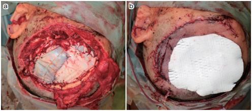 图2 (a)采用大腿深筋膜重建硬脑膜缺损 (b)用人工真皮层重建皮肤缺损