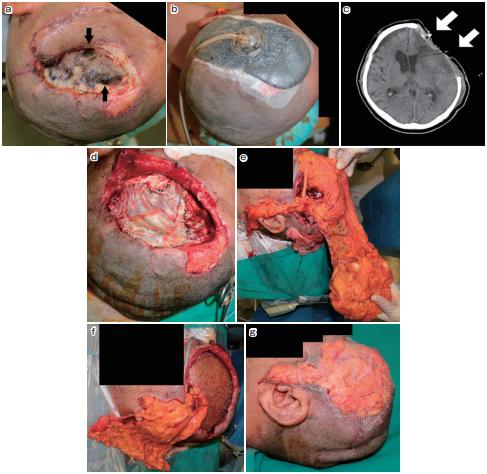术后患者头部CT显示左额叶小实质血肿。虽然在手术过程中就开始了抗生素输注,但患者还是出现了脑膜炎和脑炎。创面及脑脊液培养检测显示耐甲氧西林葡萄球菌。继续输注万古霉素(2g /d)和美罗培南(6g /d)。然而,被切断的皮肤边缘、筋膜和替代的硬脑膜依旧是坏死的(图3a)。术后第22天,整形外科医生进行清创和真空辅助闭合(VAC)治疗以促进伤口愈合(图3b)。