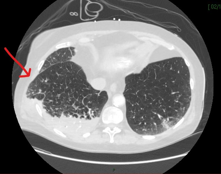 图2 胸部CT(轴位) 显示右侧肺疝和右下叶实变。红色箭头指向肺疝
