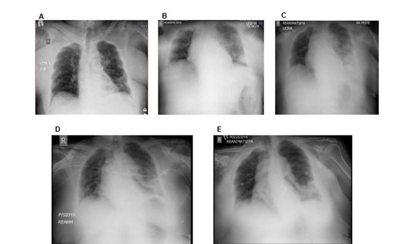常规实验室检查结果:CBC显示白细胞增多形式的以下变化,白细胞公式向左刺移,ESR升高,轻度贫血。患者尿检也显示炎症改变。血液生化显示肾功能受损,表现为肌酐和尿素水平升高,肝转氨酶轻度升高和低蛋白血症。整个期间止血系统无明显异常,凝血结果偶见轻微的低凝倾向。入院时,胸部X线片显示心脏肿大,肺部未见明显变化(图A)。入院11小时后,患者呼吸系统检查有改变,胸部对照X线片显示左侧肺炎(图B)。患者紧急转至ICU,血气分析示低氧合指数(270.3mm Hg)。PCR检验COVID-19呈阴性。在动力学方面,患者住院第3天,根据胸部X光片的结果,肺炎病情进展,需要加强抗生素治疗(图C)。在脓毒症的综合治疗中加入持续输注美罗培南(Santo, Kazakhstan, Shymkent)。在住院的第五天,一个胸部x光片显示上述情况的积极变化(图D)。住院第11天,作为综合治疗的一部分,连续输注美罗培南6天后,胸片显示左侧肺炎消退(图E)。
