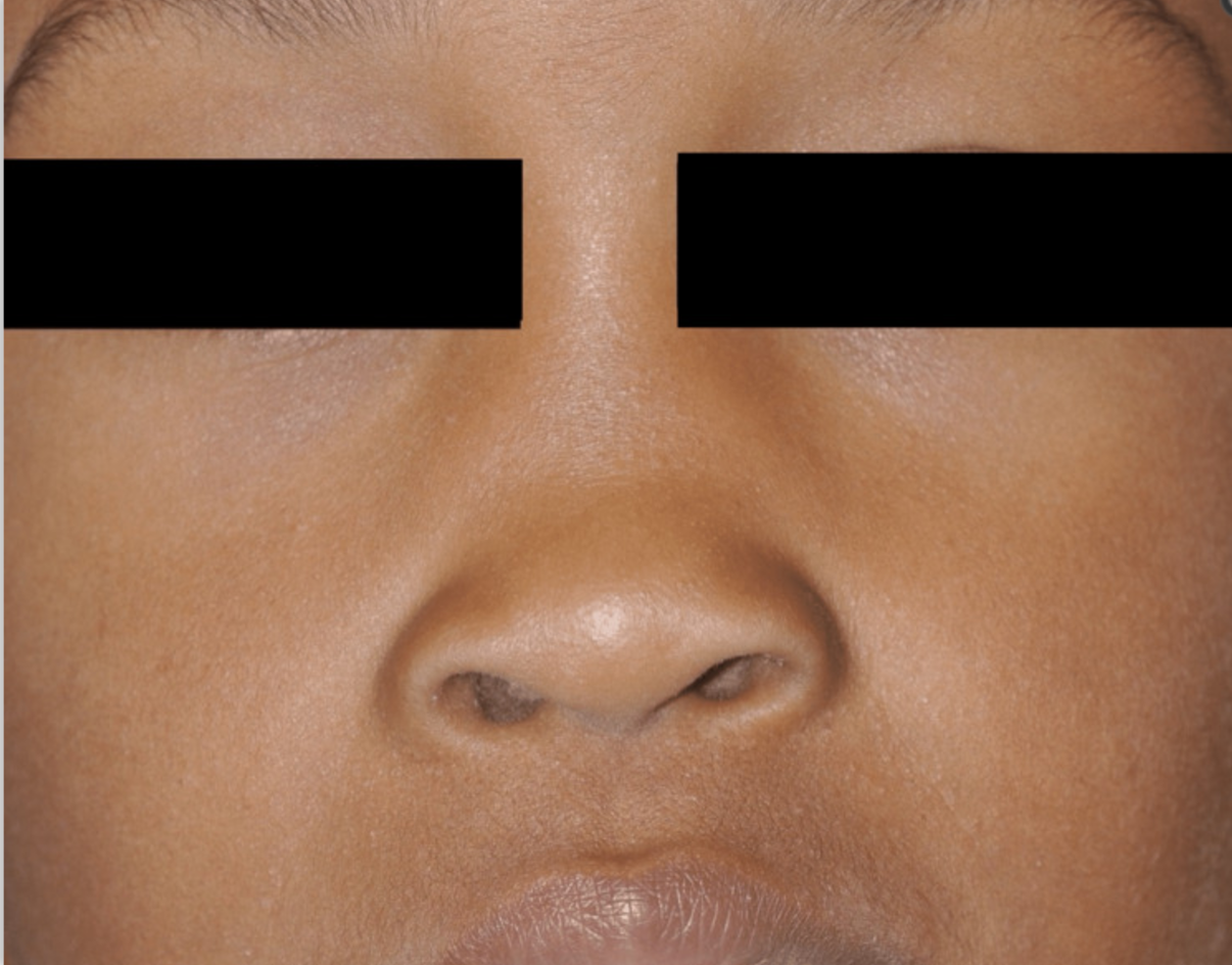 建议患儿接受腺样体、扁桃体切除术,并修复右鼻前庭梗阻,家属一致同意。患儿随后被转诊到整形外科进行进一步评估和重建计划。最终,修复被推迟到10岁,因为修复需要长时间使用鼻支架,这对幼儿来说难以耐受,并可能危及结果。此外,结合患儿长期反复旅居史,10岁是最早进行干预的合适时机。从第一次评估到手术修复,患儿只能通过左鼻腔和口腔呼吸。
