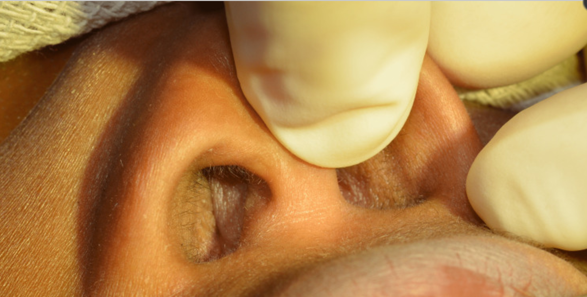 一名儿童在纽扣电池损伤后右侧鼻前庭完全堵塞的病例。患儿三岁时就诊耳鼻喉科,主诉是鼻塞和打鼾。据悉患儿六个月前在右鼻腔插入了一粒纽扣电池,三天后才被取出,具体过程不详。检查发现,患儿有腺样体扁桃体肥大和右侧鞍鼻畸形(图1)。前鼻镜检查显示右鼻气道完全阻塞(图2),未见溃疡或肉芽组织,鼻腔完全被疤痕组织堵塞。左鼻气道正常、通畅。