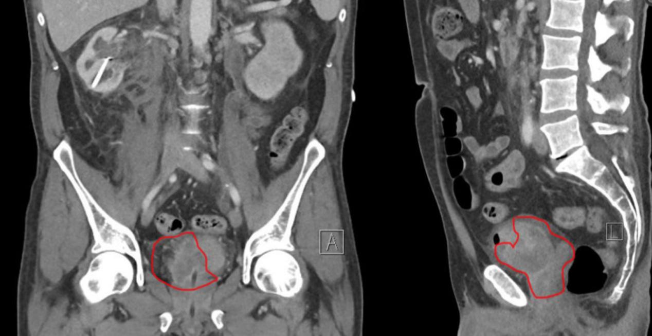 图1 对比增强CT尿路造影,肿瘤的冠状(A)和矢状(L)视图(红线)。左侧(A)显示肿瘤延伸至膀胱。在右侧(L),肿瘤延伸到膀胱、前列腺和精囊
