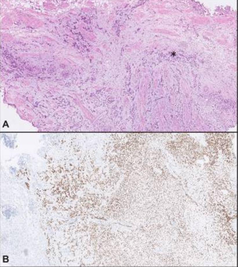 图2 TURBT标本中存在浸润固有肌层的低分化肿瘤(星号)。(A) 广泛的烧灼伪影使组织学评估变得困难(HE染色)。(B) 膀胱肿瘤中对GATA3的强阳性核反应,错误地表明肿瘤来源于尿路上皮