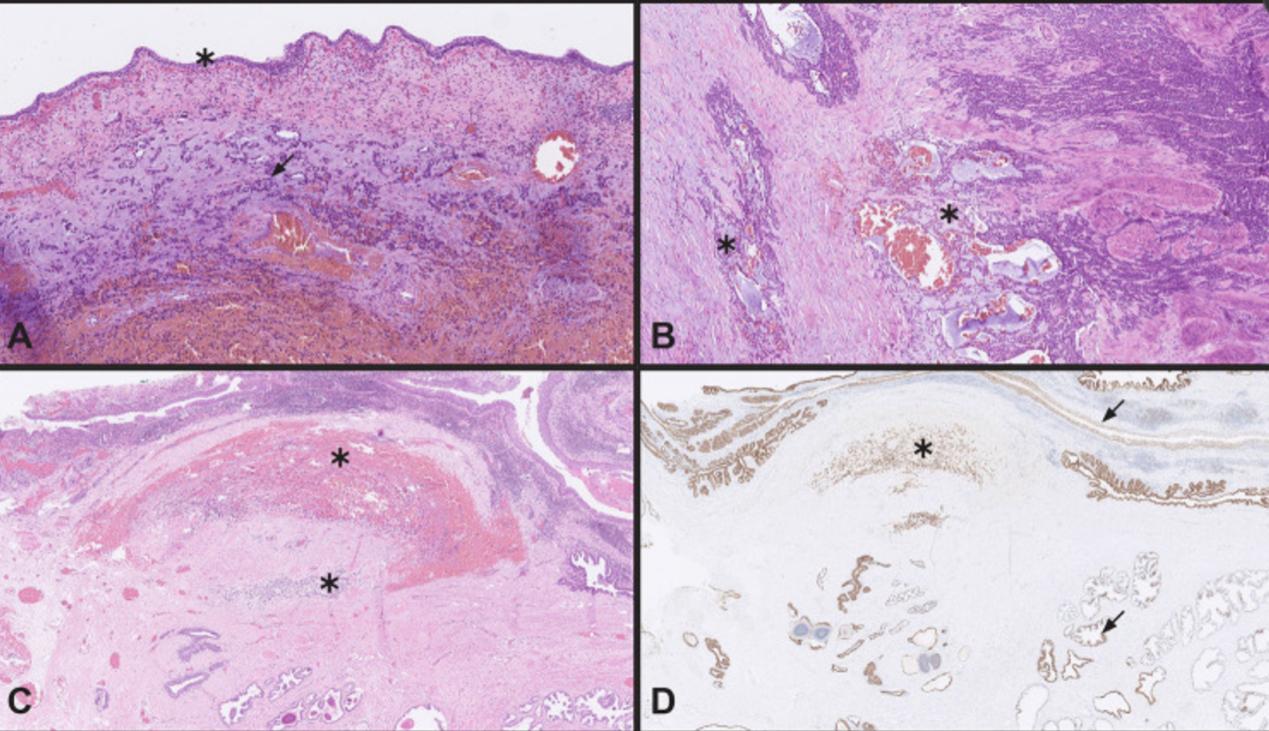 图3 膀胱前列腺切除术标本中的肿瘤形态。(A) 膀胱管腔部分的肿瘤细胞以不规则的小巢(箭头)和单细胞形式生长。未检测到原位尿路上皮癌(星号)(HE染色)。(B) 膀胱较深部分的肿瘤细胞生长在固体巢状和索状中,存在嗜酸性基底膜样物质和局灶性微囊结构,表明基底细胞癌(星号)(HE染色)。(C) 前列腺尿道周围浸润有生长在索中的基底细胞癌和肿瘤内出血的单细胞癌(星号)(HE染色)。(D) 前列腺尿道周围部分的GATA3阳性肿瘤细胞(星号)以及正常前列腺的基底细胞和前列腺尿道的尿路上皮(箭头)