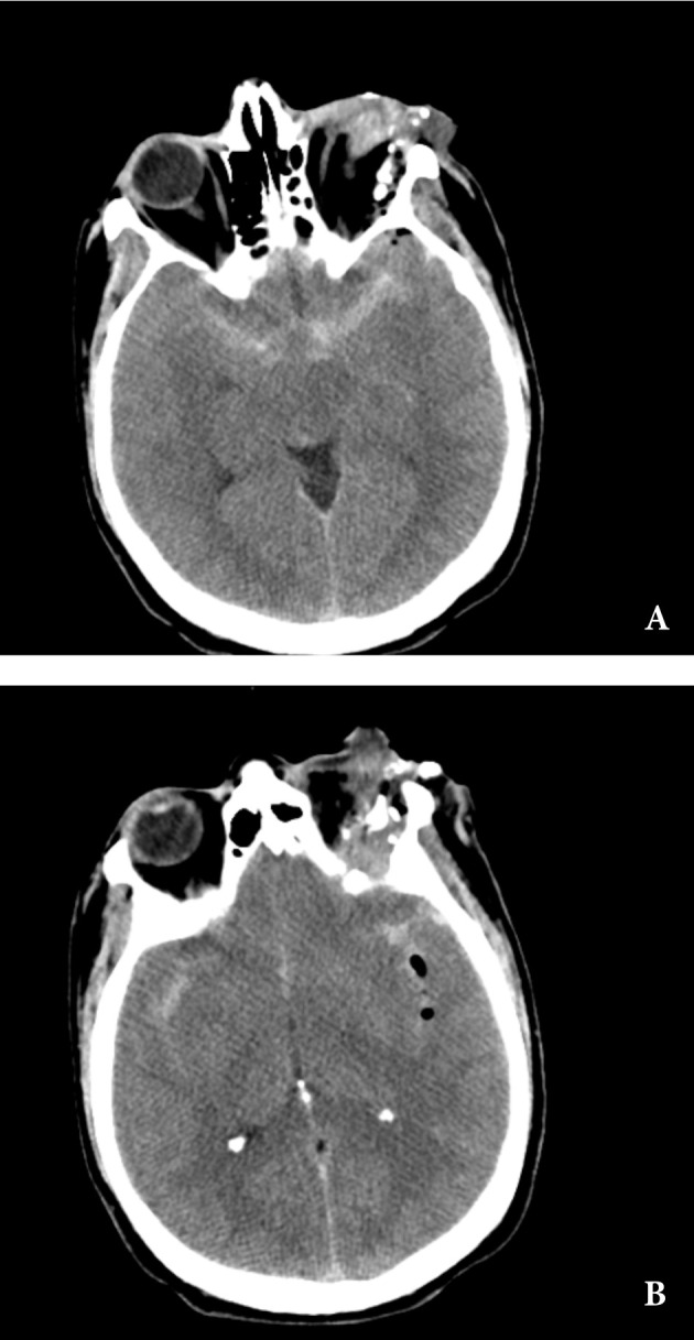 图2、急诊头颅计算机断层扫描(CT)显示蛛网膜下腔出血,左侧眼眶外侧眼外肌和左侧直肌中有放射性密集的多发性骨碎片和金属异物(a),以及左侧眼眶中上方和后方有被破坏的眼球的(箭头),以及充满少量空气的沿着抛射路径进入颅内的气肿变化(气颅) (箭头)(b)