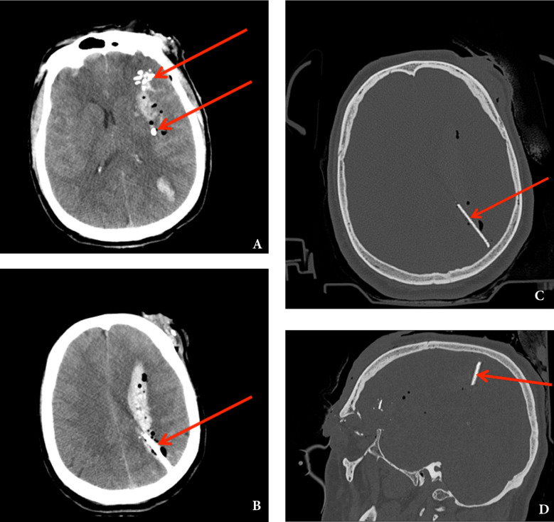 图3、原发性轴位脑CT显示脑水肿,显示沿贯穿伤撞击管(箭头)颅内残留多个放射性高密度异物和骨碎片,充满脑出血和少量颅内空气(a)。贯穿脑实质的充满血液的伤口通道,终止于左侧顶叶皮质下,尖锐的金属物体卡在此处(箭头)(b)。轴位(c)和矢状位脑CT骨窗重建(d),识别垂直于顶骨的颅内残留金属物体(箭头)