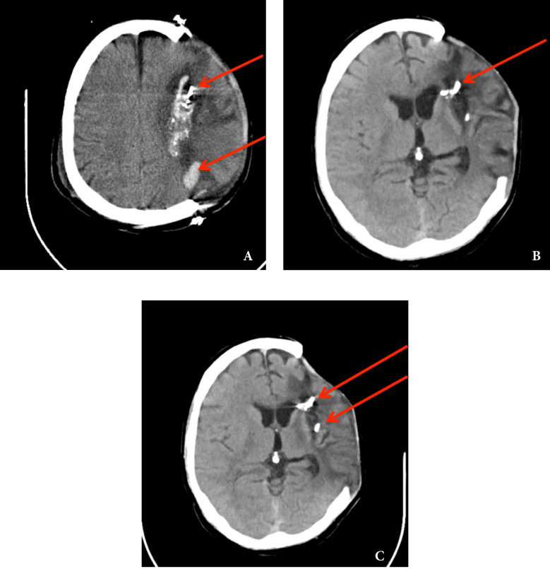 图6、术后早期颅脑自然轴位CT扫描显示左半球弥漫性水肿,肿块突出于颅骨缺损的边缘,穿透性伤口撞击路径充满残留异物,并出现颅内出血(箭头)(a)。在损伤后第45天进行的复查自然轴位脑CT显示轴位内脑出血几乎完全消退,伴有零星的创伤后脑病区和残留的骨碎片(箭头),但没有肿块效应/中线移位,左侧脑室前角轻微增大(b)。在6个月的检查中执行的大脑对照轴位CT显示左额顶叶区创伤后脑实质缺失区域以及右额顶叶中残留的异物(箭头)(c)