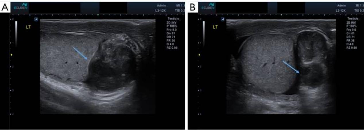 图1 附睾结核患者的阴囊超声图像。(A,B)左侧附睾严重扩张,回声不均匀(蓝色箭头),不规则形状的液体填充,提示形成脓肿的严重附睾炎