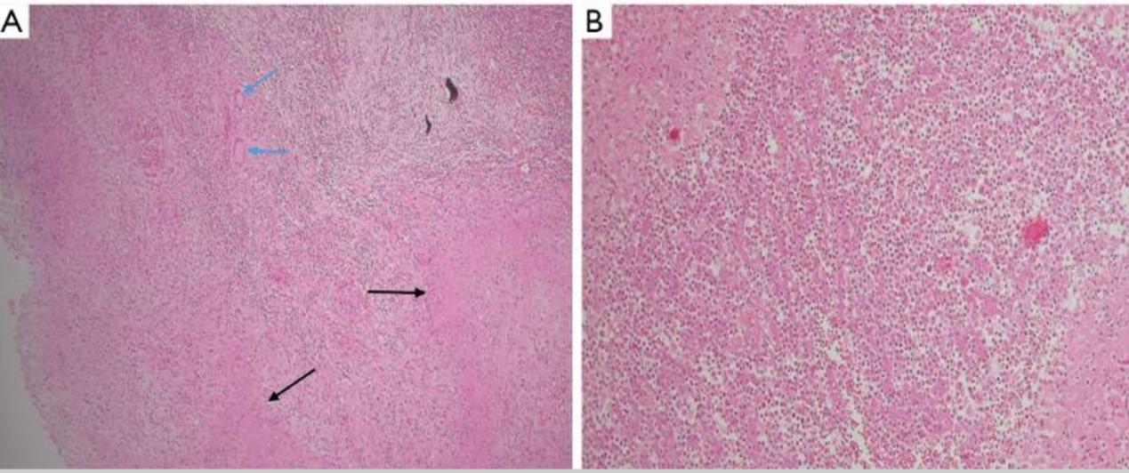 图2 切除附睾组织的组织病理学表现。(A) 慢性肉芽肿性炎症(黑色箭头)伴有干酪样坏死及Langhans巨细胞(蓝色箭头)(HE,40×)。(B) 肉芽肿(HE,100×)的外围部分可见脓肿形成