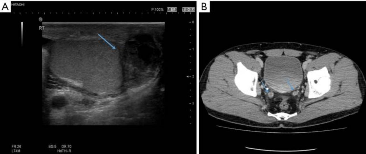图3 术后约1个月进行了阴囊超声检查和计算机断层扫描。(A) 阴囊超声检查显示右侧附睾区(蓝色箭头)出现肿胀和不均匀的脓肿。(B) 在计算机断层扫描上发现两个输精管增厚意味着结核受累(蓝色箭头)
