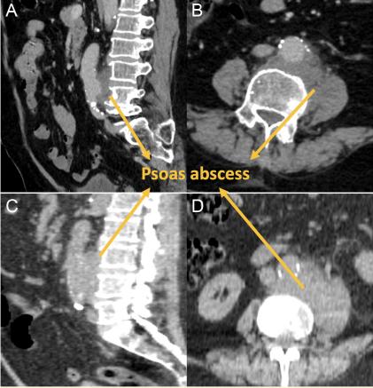 图1所示。(A-B)一个月前,腹部CT显示腹主动脉旁椎旁腰肌脓肿的轴位和矢状面图像。
