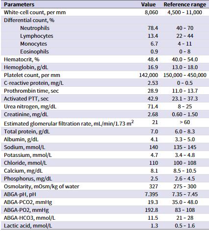 实验室检查显示白细胞计数为8,060/mm3,C反应蛋白水平为2.53 mg/dL,血清肌酐水平为2.68 mg/dL,血清白蛋白水平为4.1g/dL,血清钠、钾和氯化物水平分别为140、4.7和110 mmol/L。在动脉血气面板中,pH为7.395,PCO2为19.3 mmHg,测得的HCO3为11.5 mmol/L(表1)。阴离子间隙计算值为18.5 mmol/L。INR值和活化部分凝血活酶时间(PTT)延长。对尿液化学成分的进一步分析显示,尿液中的钠含量为57 mEq/L,尿液中的氯化物含量为33 mEq/L,计算出的钠排泄分数为0.8%。