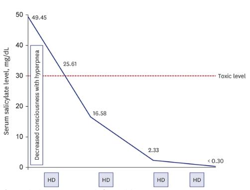 报告对比血液透析前和血液透析过程中测定的血液中水杨酸盐水平。结果证实了疑似摄入过量乙酰水杨酸,初始症状时水杨酸盐水平为49.45 mg/dL(治疗范围3-30 mg/dL,毒性> 30mg/dL(图一)。在第一次血液透析治疗后,水杨酸盐水平直接降至25.61 mg/dL,并且在每日4次血液透析治疗后,水杨酸盐水平降至< 0.30 mg/dL。