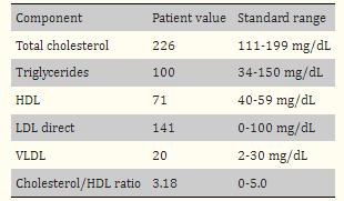 表1、患者就诊时的血脂检查显示总胆固醇、高密度脂蛋白和低密度脂蛋白升高