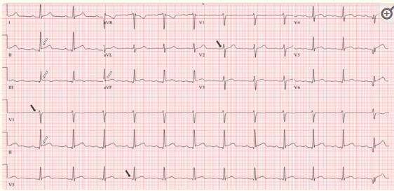 图1、心电图显示轻度弥漫性ST段抬高(白色箭头)和一度房室传导阻滞(黑色箭头)
