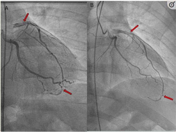 图2、左前降支(LAD)近端段的1型自发性冠状动脉夹层,涉及整个LAD,TIMI血流3 (A和B)。箭头指向多个射线可透过的管腔。TIMI:心肌梗死的溶栓治疗