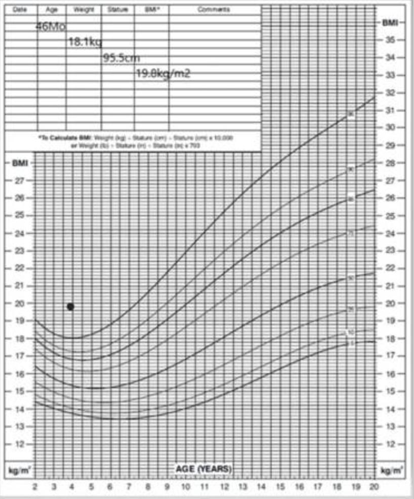 一名三岁女孩因眼肌麻痹和共济失调2周就诊,伴情绪变化、社交退缩、食欲显著增加,三个月内体重快速增加(图1)。其父母最初将其体重和行为症状归因于新冠肺炎大流行期间缺乏体力活动。患儿后出现吞咽困难、多尿和夜间遗尿,体重从14.0公斤(第25百分位)增加到了18.1公斤(第85.9百分位(图1))。患儿既往体检,无特殊病史。