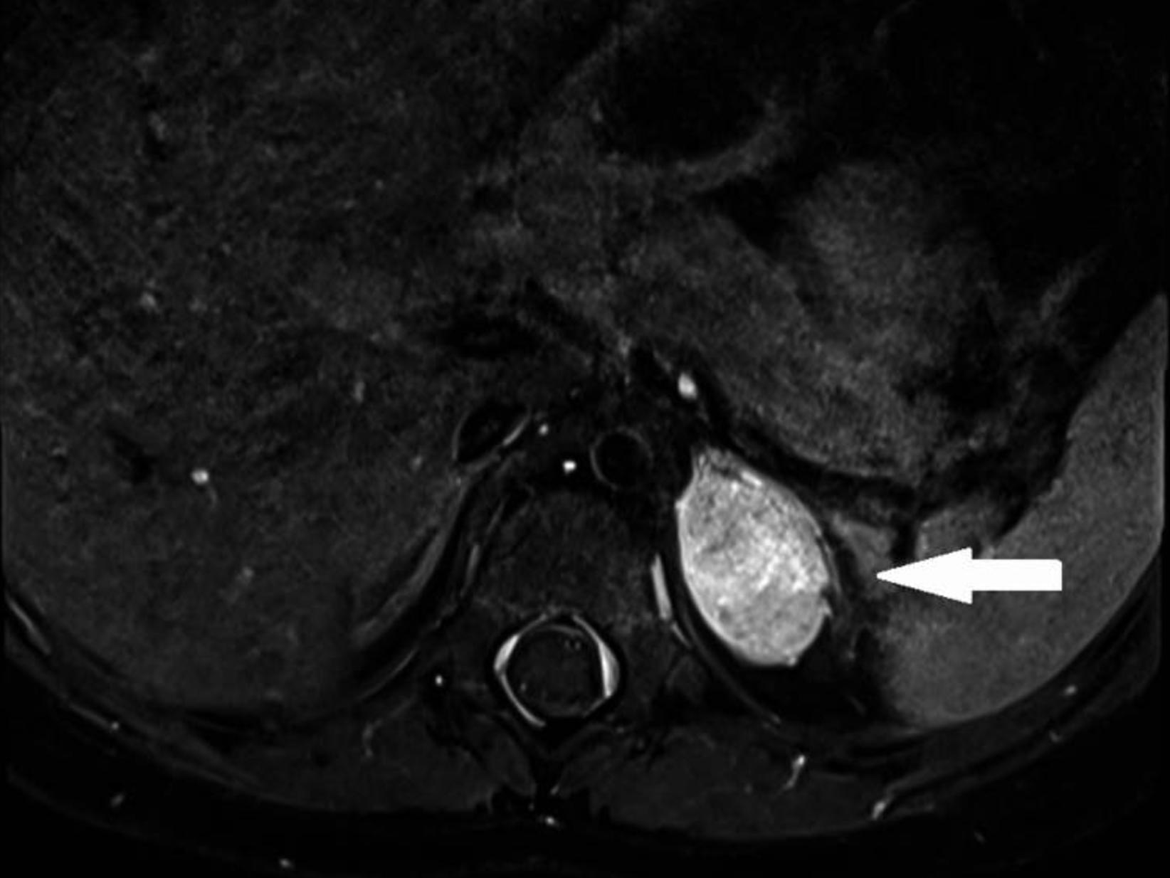 全脑和脊柱MRI检查,发现左肾上腺区肿物(图2)。胸部和腹部CT证实左肾上腺肿块约1.6×2.6×2.4厘米。在腹腔镜检查中,发现了一个4.5×3.0×2.0厘米光滑的肾上腺肿块,并将其完全切除。肿瘤的组织学表现为典型的神经节细胞瘤,多处钙化灶伴淋巴细胞浸润。根据肥胖、水平衡紊乱(低钠血症)、高泌乳素血症、多导睡眠图异常以及PHOX2B突变的缺失,患者被确诊为ROHHADNET。