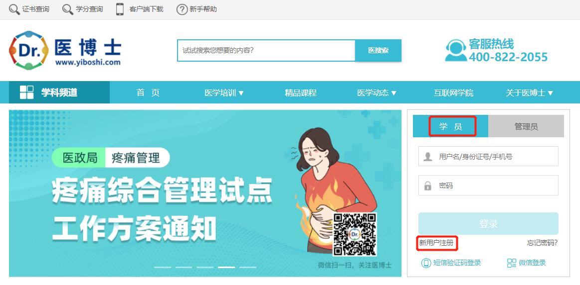 浏览器打开医博士官网(网址:www.yiboshi.com)或下载“医博士”手机APP。已注册学员输入原有账号(用户名/身份证号/手机号)、密码登录。未注册学员注册后再登录。