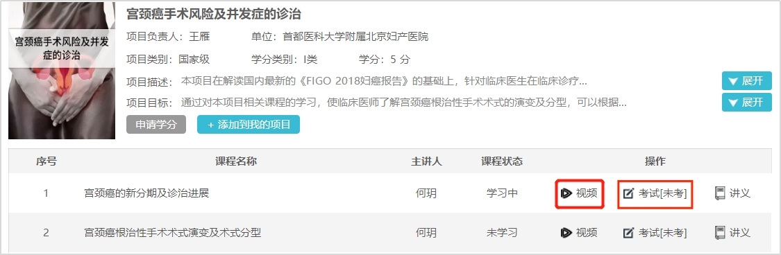 登录成功后,进入个人学习中心,选择相应培训班,可通过“项目导航”搜索相关项目添加到我的项目中完成视频学习和考试。注意:视频学习进度满足达标要求,方视为完成视频学习。快进不计入学习进度,请勿快进学习。