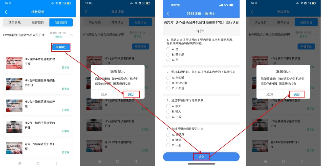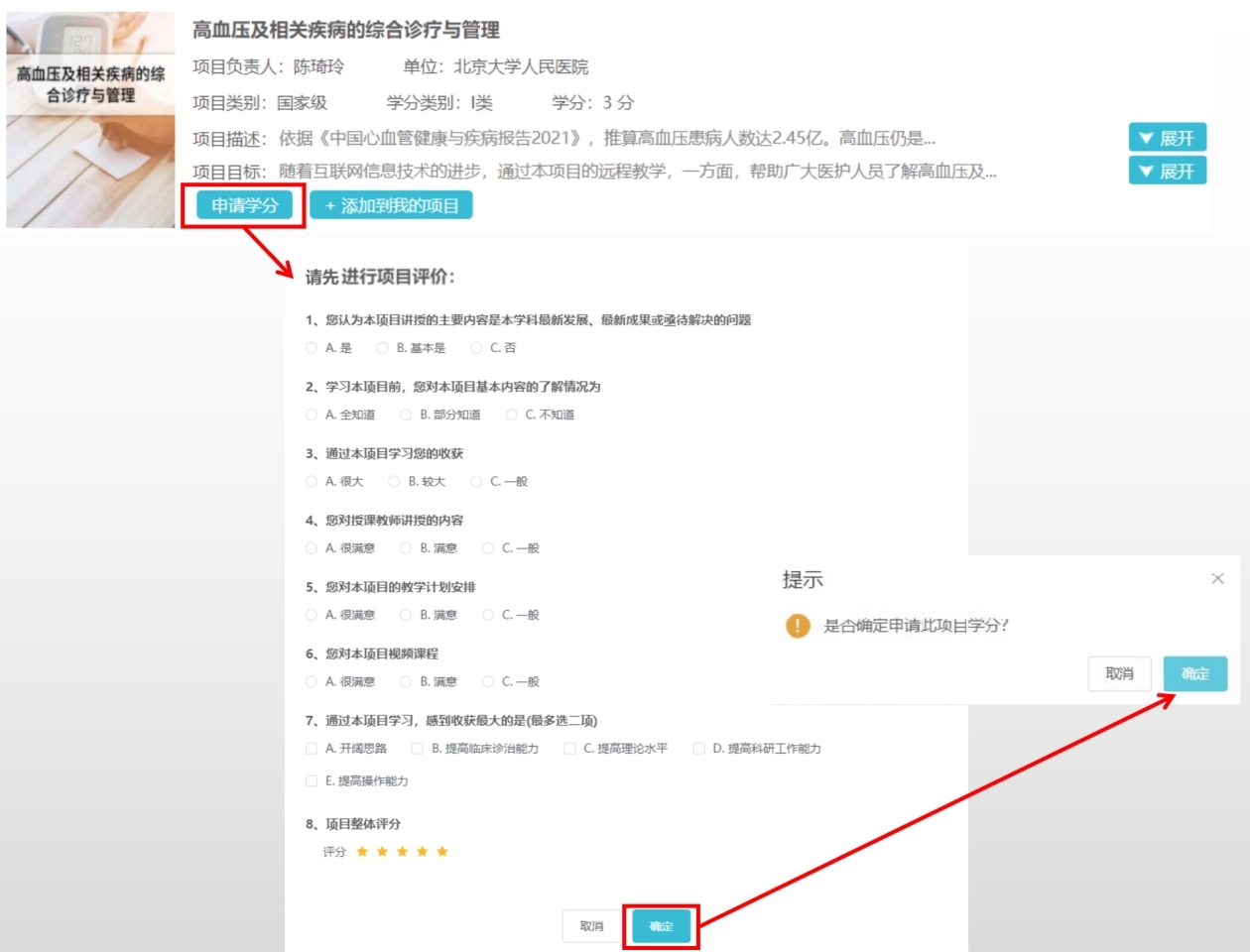 项目状态变为“已学完”后,点击“申请学分”完成项目评价后即可申请学分。