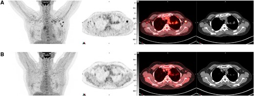 图1、患者胸部的PET/CT A从左至右,冠状最大密度投影图像、轴位PET、PET/CT叠加和轴位CT扫描,从伊曲康唑转换为泊沙康唑治疗后约1周。B6个月后,在环磷酰胺的第六个周期时,相同的图像序列